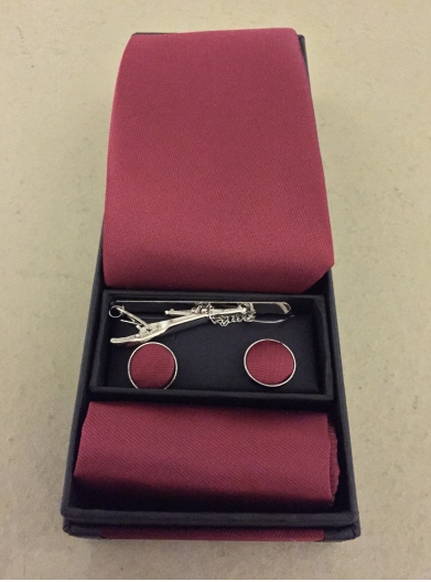 Lovely looking - 4 pcs set of; tie, cuff links, tie pin and handkerchief in wine, very nicely packed inside the gift box.