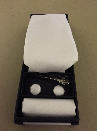 Lovely looking - 4 pcs set of; tie, cuff links, tie pin and handkerchief in white, very nicely packed inside the gift box.