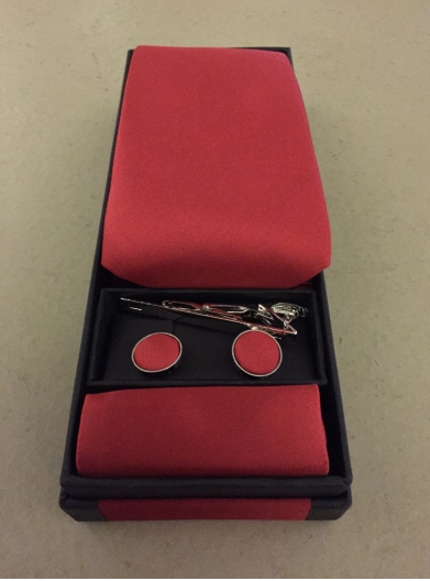 Lovely looking - 4 pcs set of; tie, cuff links, tie pin and handkerchief in red, very nicely packed inside the gift box.